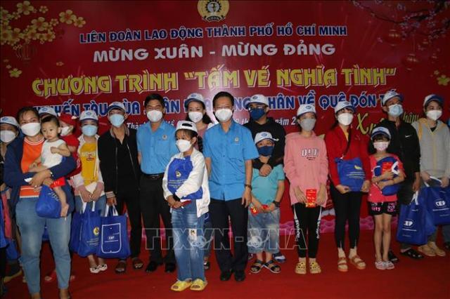 Lãnh đạo Liên đoàn Lao động TP Hồ Chí Minh chúc Tết tặng quà cho công nhân lao động về quê đón Tết trên "Chuyến tàu mùa Xuân". ảnh: TTXVN |