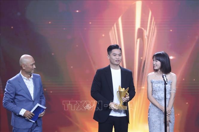 Ban tổ chức trao Cup Chiến thắng, hạng mục Nam VĐV của năm cho VĐV bắn súng Phạm Quang Huy. Ảnh: Minh Quyết/TTXVN. |