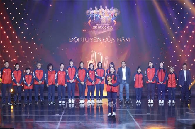 Ban tổ chức trao Cúp Chiến thắng, hạng mục Đội tuyển của năm cho đội tuyển Bóng chuyền nữ. Ảnh: Minh Quyết/TTXVN |