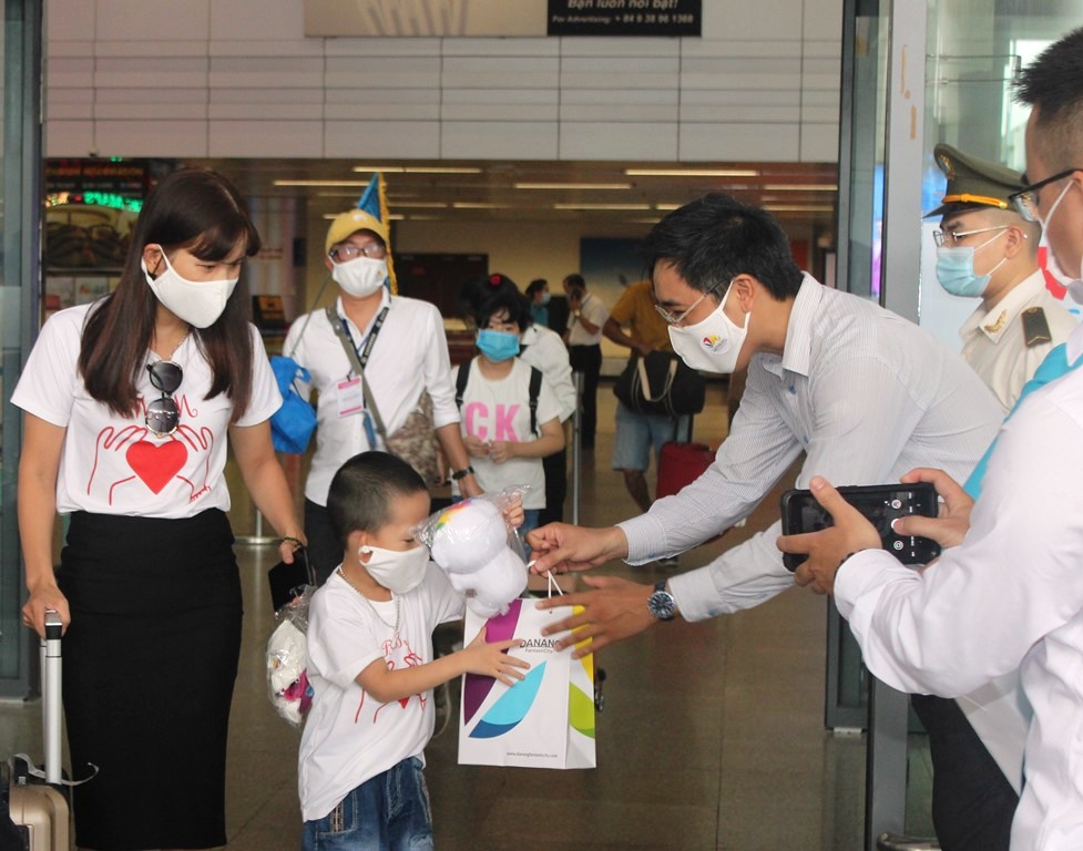 Những hành khách đầu tiên trở lại Đà Nẵng sau dịch được tặng quà kỷ niệm. Ảnh: Phương Cúc/VOV Miền Trung |