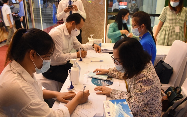 Người đến dự chương trình khai báo y tế, đeo khẩu trang. Ảnh:nhandan.com.vn |