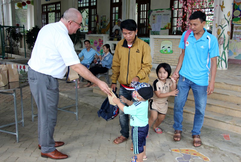Đại sứ Bỉ Paul Jansen tặng các túi quà là đồ dùng vệ sinh cá nhân cho các học sinh trường mầm non Hoa Mai, xã Trà Mai (huyện Nam Trà My, tỉnh Quảng Nam). Ảnh (VOV) |