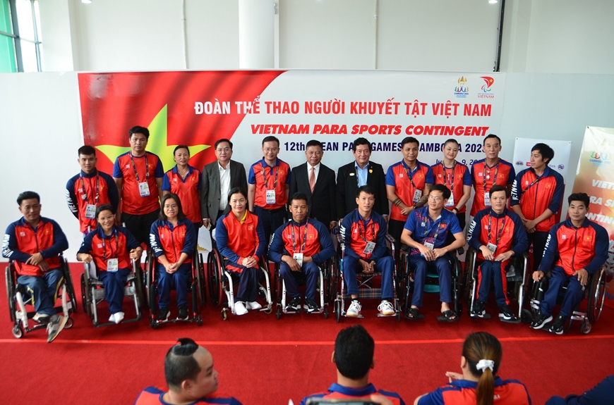 Đại diện Đại sứ quán Việt Nam tại Campuchia chụp ảnh cùng đoàn thể thao người khuyết tật Việt Nam. Ảnh: Thái Dương/qdnd.vn |