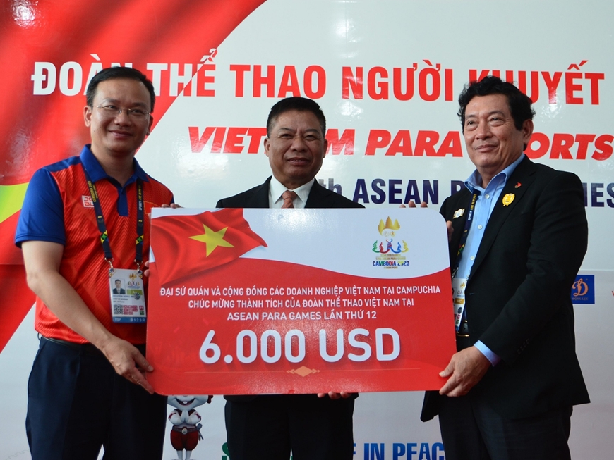 Chiều 08/06, Đại sứ đặc mệnh toàn quyền Việt Nam tại Campuchia Nguyễn Huy Tăng và đại diện cán bộ nhân viên đại sứ quán, cộng đồng doanh nghiệp Việt Nam đang hoạt động tại Campuchia đã tới thăm và chúc mừng thành tích đoàn thể thao người khuyết tật Việt Nam tại ASEAN Para Games 12.