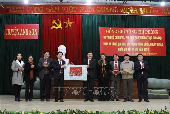 Đoàn công tác do Phó Chủ tịch Thường trực Quốc hội Tòng Thị Phóng làm Trưởng đoàn đến thăm, trao quà và chúc Tết thân nhân các gia đình liệt sỹ, gia đình chính sách, người có công với cách mạng, gia đình có hoàn cảnh khó khăn trên địa bàn 2 huyện Anh Sơn và Con Cuông (Nghệ An).- Ảnh: Nguyễn Oanh/TTXVN |
