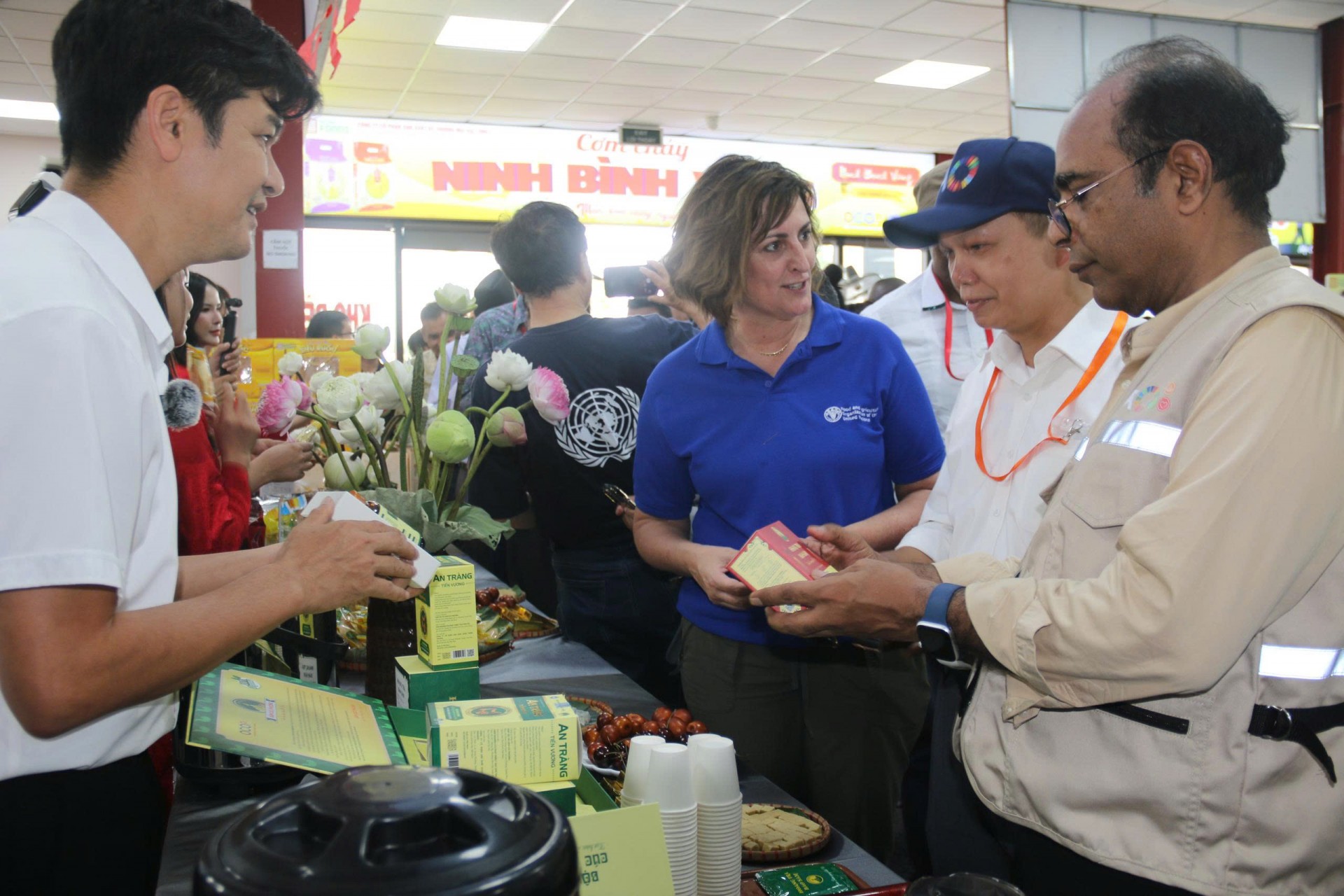 Phó Tổng Giám đốc FAO Beth Bechdol (áo xanh)và các đại biểu quốc tế thăm các gian hàng OCOP Ninh Bình. |