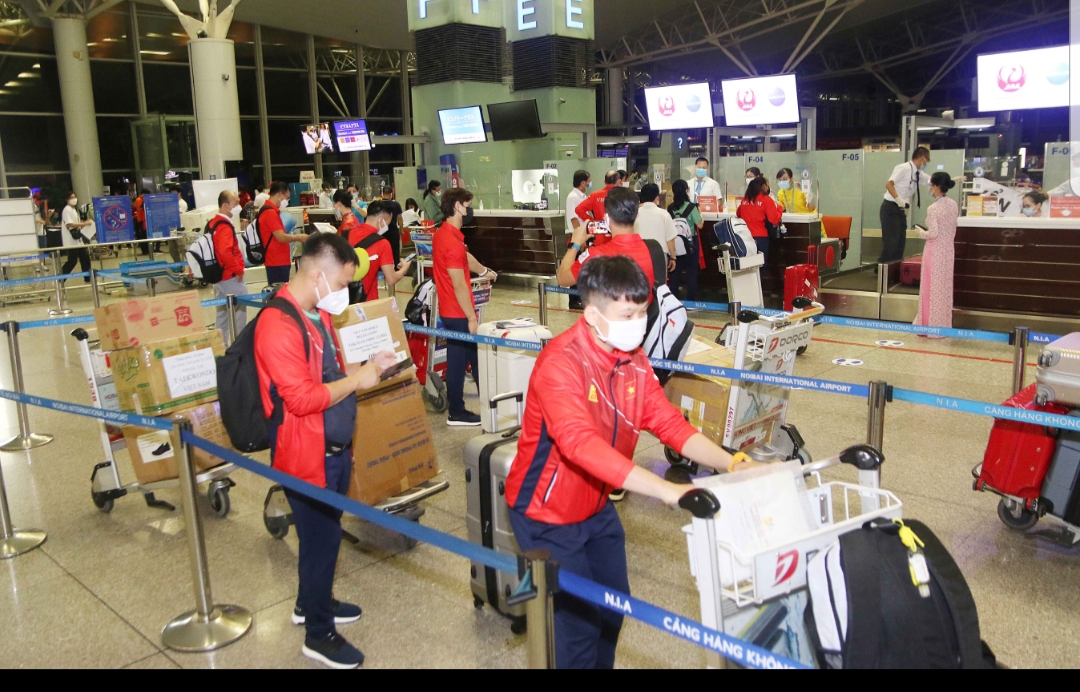 Các thành viên của đoàn thể thao Việt Nam tại sân bay quốc tế Nội Bài |