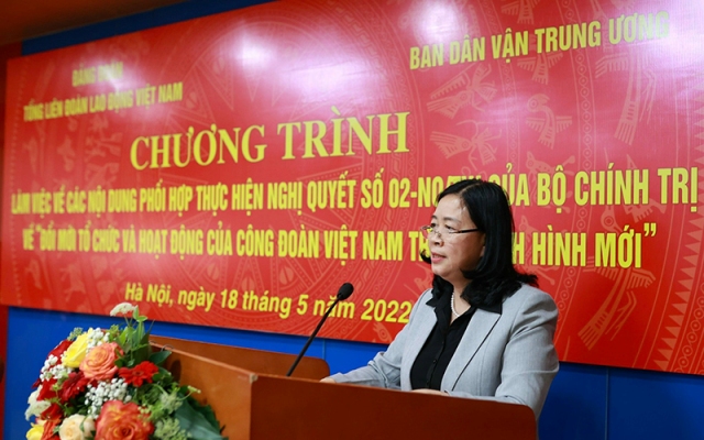 Phát biểu tại buổi làm việc, Trưởng ban Dân vận Trung ương Bùi Thị Minh Hoài ghi nhận, đánh giá cao sự chủ động của Đảng đoàn Tổng Liên đoàn Lao động Việt Nam trong việc phối hợp với Ban Dân vận Trung ương đánh giá kết quả bước đầu triển khai thực hiện Nghị quyết.