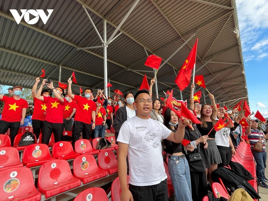 Bà con trong cộng đồng người Việt tại Nga nhiệt tình cỗ vũ cho kíp xe tăng Việt Nam - Ảnh: PV VOV tại Nga |