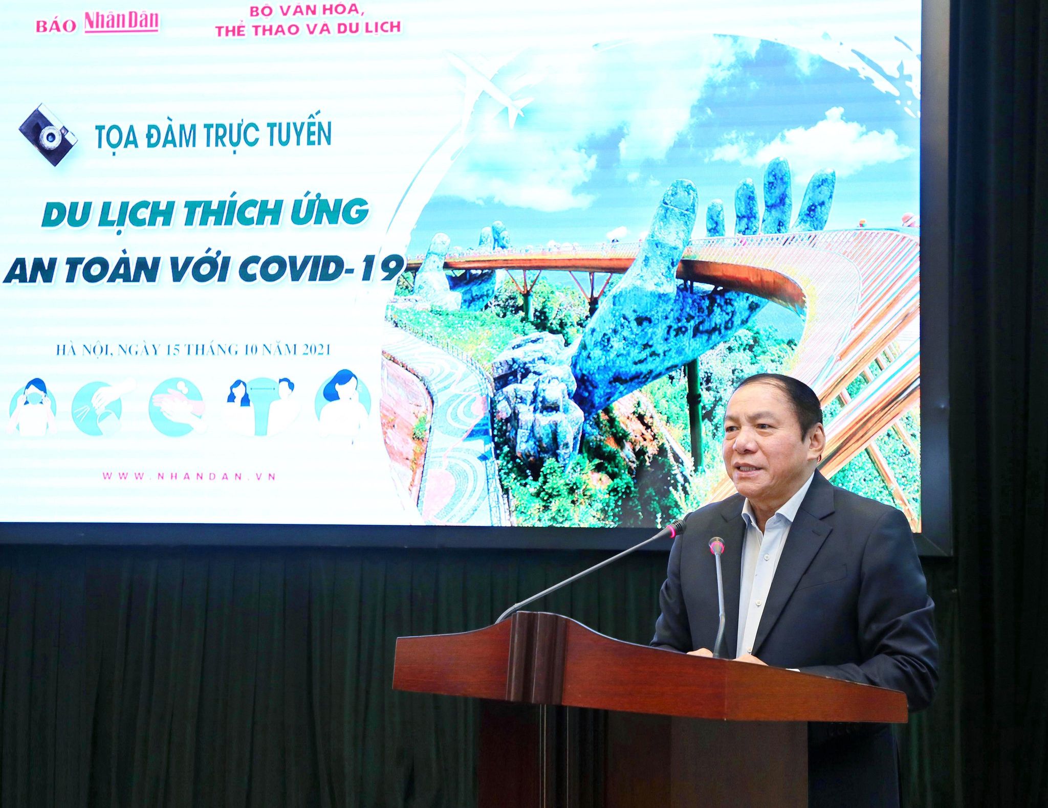 Sáng ngày 15/10, Báo Nhân Dân phối hợp Bộ Văn hóa, Thể thao và Du lịch tổ chức buổi Tọa đàm theo chủ đề: “Du lịch thích ứng an toàn với Covid-19”, nhằm phân tích rõ thực trạng của ngành du lịch sau gần 2 năm hứng chịu những tổn thất nặng nề bởi đại dịch Covid-1ịch bệnh COVID-19 đã bước sang năm thứ 2, tác động nghiêm trọng tới ngành du lịch Việt Nam và thế giới.
