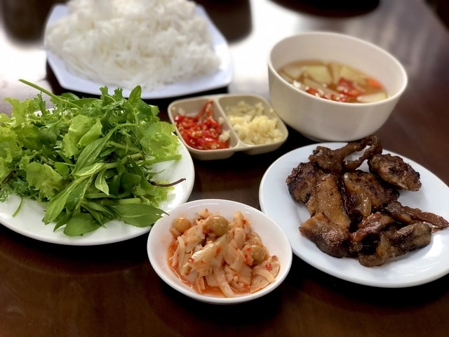 Bún chả Lạng Sơn hấp dẫn với thịt lợn nướng trên than hoa và bát nước chấm chua cay mặn ngọt, thêm măng ớt tạo nên hương vị khó quên. |
