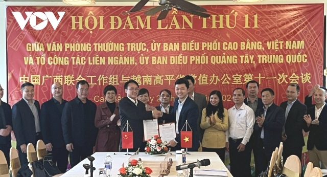 Đại diện Văn phòng Thường trực, Ủy ban điều phối tỉnh Cao Bằng (Việt Nam) và Tổ công tác liên ngành, Ủy ban điều phối Quảng Tây (Trung Quốc) ký kết biên bản các nội dung đã thống nhất. Ảnh: VOV |