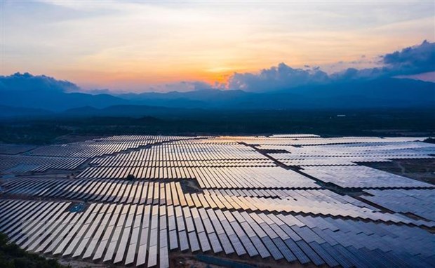 Cánh đồng “pin” năng lượng mặt trời dưới chân Núi Cấm của Nhà máy điện mặt trời Sao Mai-An Giang. Ảnh: TTXVN |