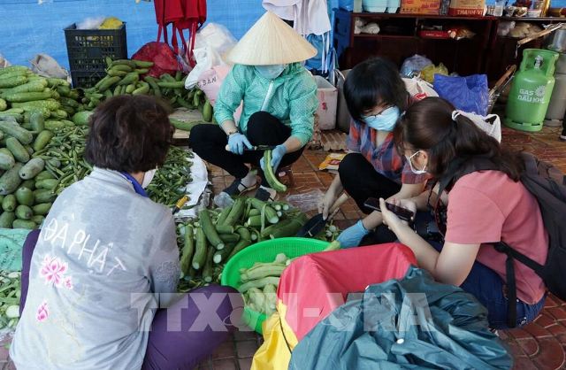 Các giáo viên, công nhân viên ngành giáo dục, sơ chế và nấu thức ăn cho các chốt kiểm soát y tế. Ảnh: Trung Kiên - TTXVN |