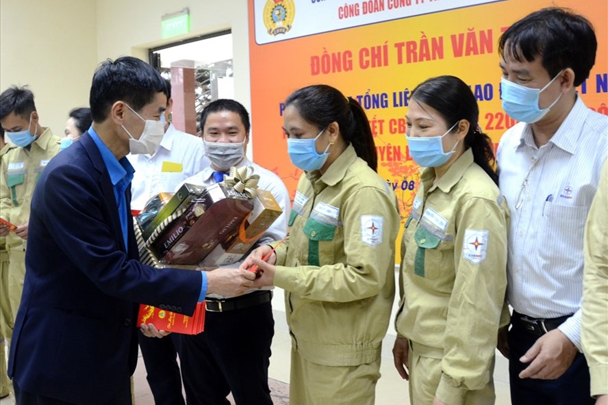 Phó Chủ tịch Tổng Liên đoàn Lao động Việt Nam Trần Văn Thuật tặng quà đoàn viên ngành điện lực, nhân dịp Tết Nguyên đán Tân Sửu 2021. Ảnh: Hà Anh/laodong.vn |