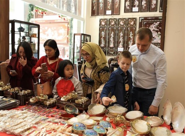 Du khách thích thú với các sản phẩm thủ công mỹ nghệ khảm trai, sơn mài |