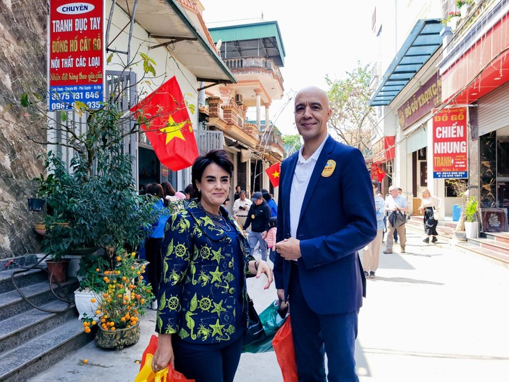 Đại sứ Marốc tại Việt Nam Jamale Chouaibi và phu nhân trải nghiệm mua sắm ở làng khảm trai, sơn mài Chuyên Mỹ. |
