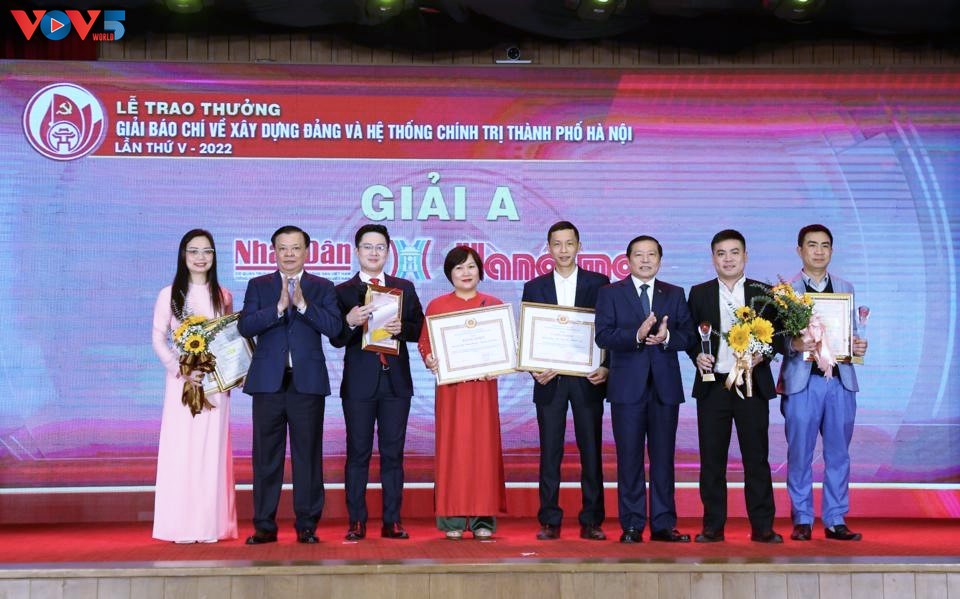 Bí thư Thành ủy Hà Nội Đinh Tiến Dũng (thứ 2, từ trái) và Phó trưởng ban Thường trực Ban Tuyên giáo Trung ương Lại Xuân Môn (thứ 3, từ phải) trao giải A cho các tác giả đoạt giải. Ảnh: VOV |