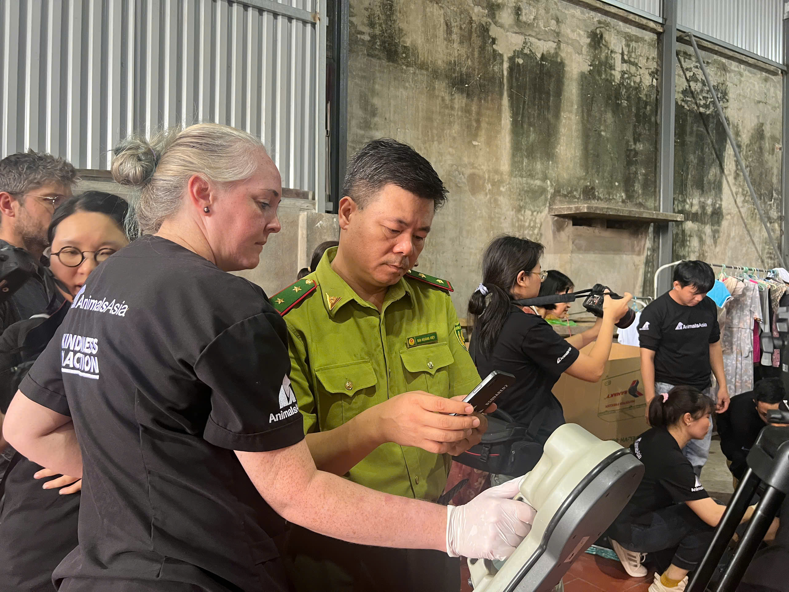 Cán bộ kiểm lâm cùng Tổ chức Động vật Châu Á kiểm tra xác nhận chip quản lý gấu. Ảnh: Animals Asia |
