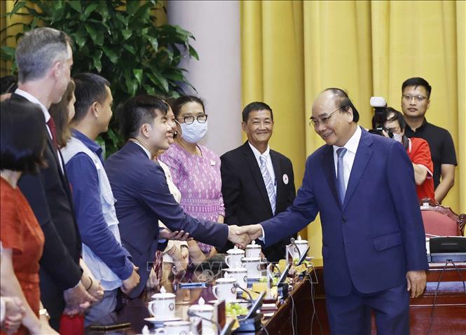 Chủ tịch nước Nguyễn Xuân Phúc tiếp các đại biểu. Ảnh: Thống Nhất/TTXVN |