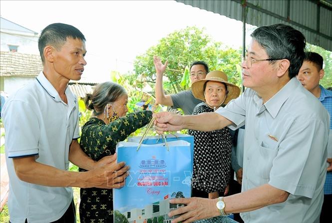 Ủy viên Bộ Chính trị, Giám đốc Học viện Chính trị quốc gia Hồ Chí Minh Nguyễn Xuân Thắngthăm hỏi, động viên, trao tặng quà cho gia đình bị thiệt hại do ảnh hưởng của cơn bão Yagi. Ảnh: TTXVN |