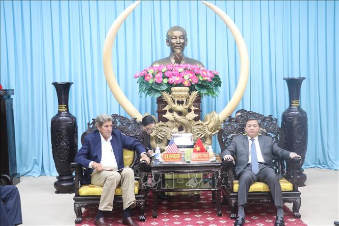 Đặc phái viên của Tổng thống Hoa Kỳ về biến đổi khí hậu John Kerry làm việc với Bí thư tỉnh ủy Bến Tre Lê Đức Thọ. Ảnh: TTXVN |