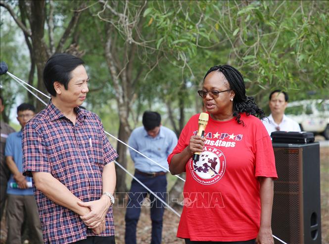 Đại sứ Bonnie Denise Jenkins, Thứ trưởng phụ trách lĩnh vực kiểm soát vũ khí và an ninh quốc tế, Bộ Ngoại giao Hoa Kỳ phát biểu tại hiện trường xử lý bom mìn khu vực xã Triệu Sơn, huyện Triệu Phong. Ảnh: TTXVN |