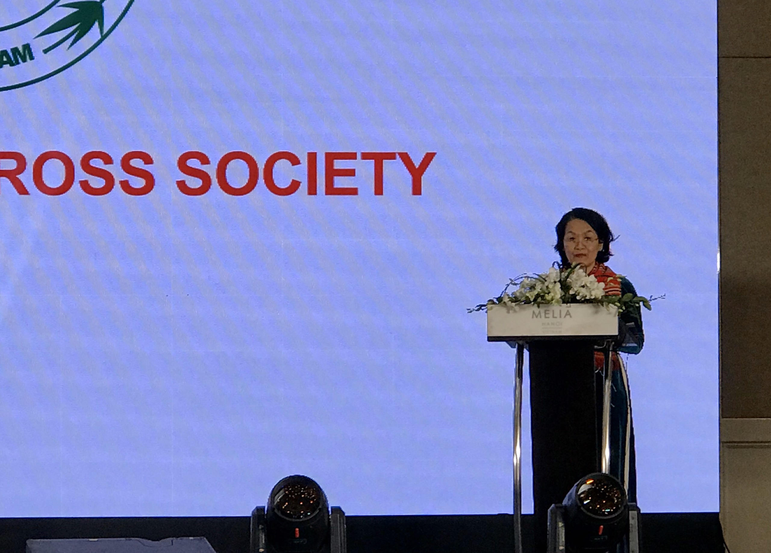 Bà Bùi Thị Hoà, Chủ tịch Hội Chữ thập đỏ Việt Nam, phát biểu khai mạc hội nghị Hội Chữ thập đỏ - Trăng lưỡi liềm đỏ khu vực Châu Á - Thái Bình Dương lần thứ 11 (AP-11). |
