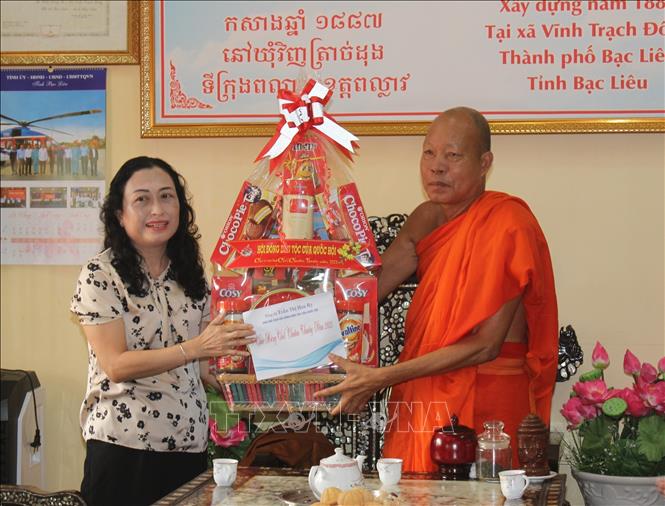 Bà Trần Thị Hoa Ry - Phó Chủ tịch Hội đồng Dân tộc tặng quà cho Đại đức Dương Quân, trụ trì chùa Xiêm Cán, xã Vĩnh Trạch Đông, thành phố Bạc Liêu, tỉnh Bạc Liêu - Ảnh: Anh Tuấn/TTXVN |