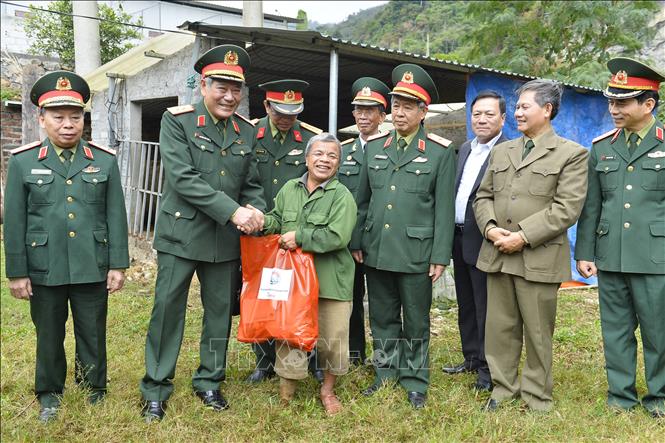 Trung tướng Nguyễn Đức Soát, Chủ tịch Hội Hỗ trợ khắc phục hậu quả bom mìn Việt Nam cùng đoàn công tác thăm hỏi, tặng quà ông Nông Đình Dũng, nạn nhân bom mìn ở thôn Giang Nam, xã Thanh Thủy, huyện Vị Xuyên. Ảnh: Minh Đức/TTXVN |