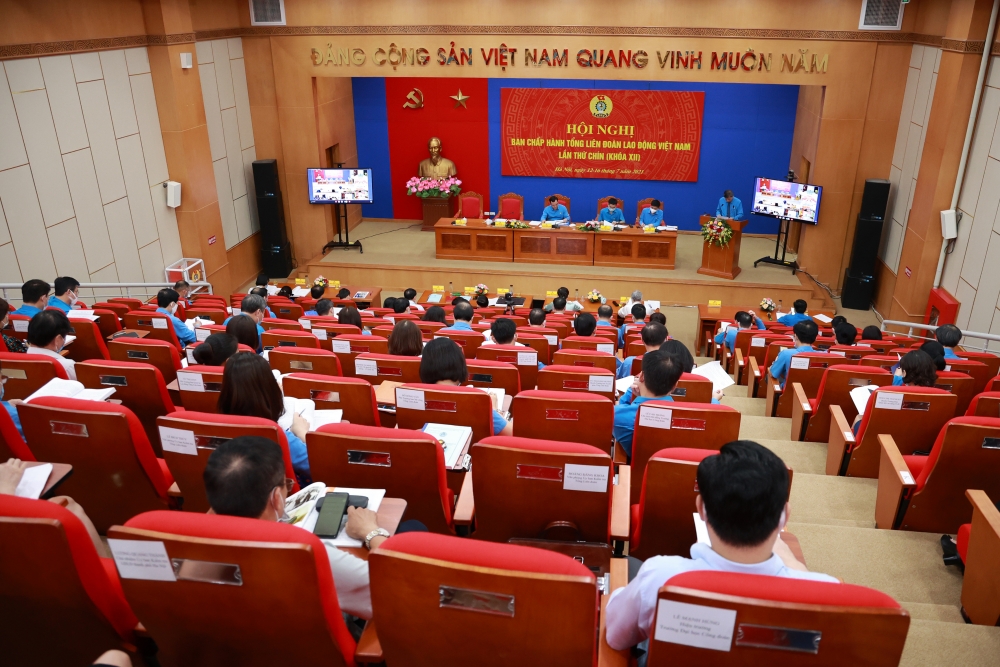 Ảnh: Toàn cảnh Hội nghị lần thứ 9 Ban Chấp hành Tổng Liên đoàn khóa XII tại điểm cầu Hà Nội. Ảnh:laodong.vn |