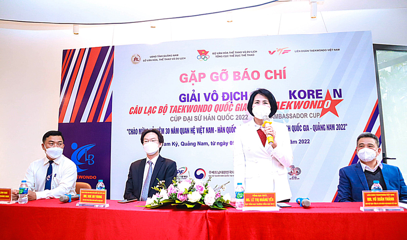 Phó Tổng cục trưởng Tổng cục Thể dục thể thao Lê Thị Hoàng Yến phát biểu tại cuộc họp báo Giải vô địch các câu lạc bộ Taekwondo - Cúp Đại sứ quán Hàn Quốc năm 2022. Ảnh: hanoimoi.com.vn |