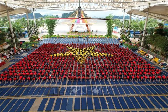 Các vận động viên Yoha cùng màn biểu diễn xếp hình cờ đỏ, sao vàng. Ảnh: TTXVN |