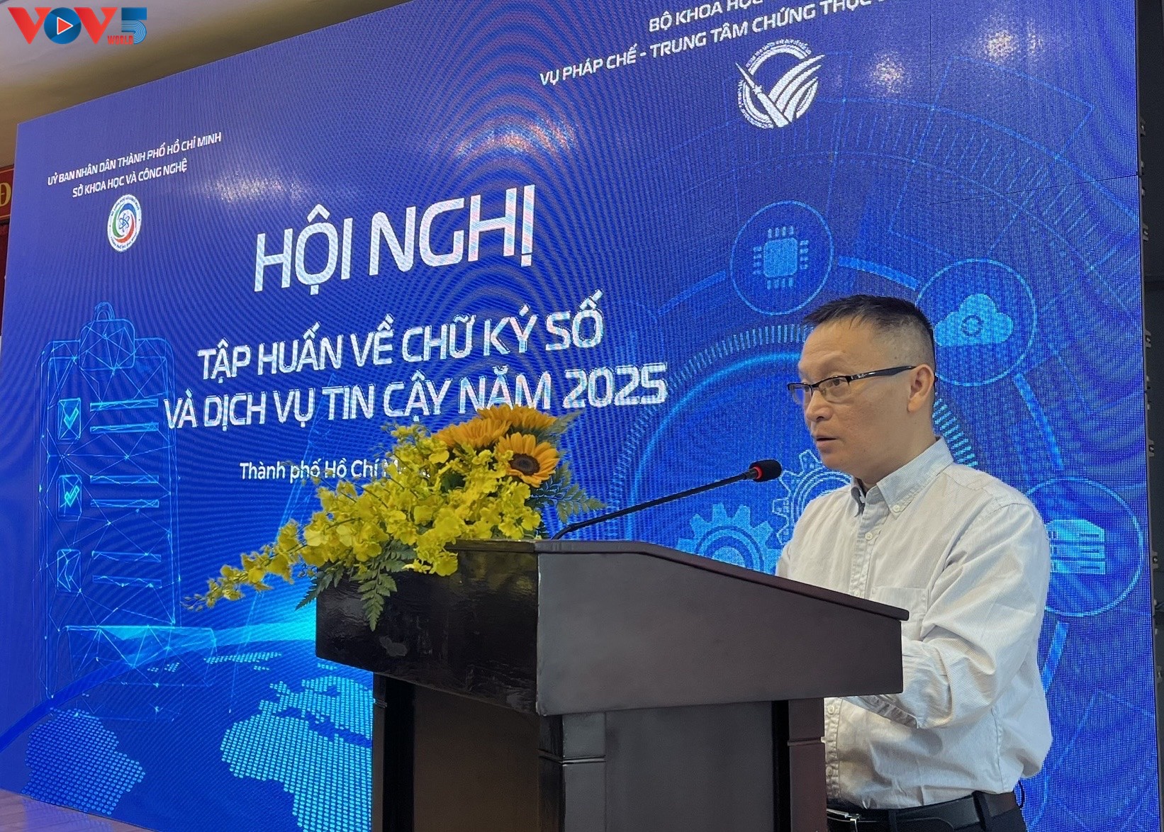 Ông Đinh Quang Trung, Phó Giám đốc Trung tâm Chứng thực Điện tử Quốc gia phát biểu. Ảnh: VOV |
