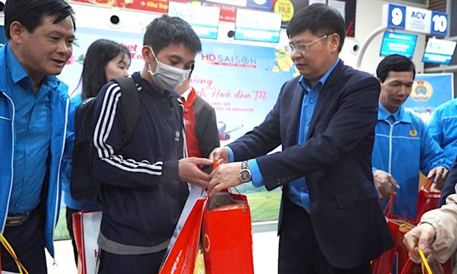 Phó Chủ tịch Tổng LĐLĐVN Phan Văn Anh tặng quà Tết cho người lao động được đi máy bay miễn phí về quê đón Tết Quý Mão 2023. Ảnh: Quách Du |