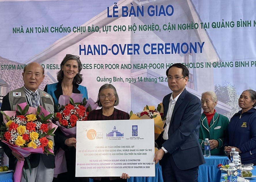 Cuối năm 2020, UNDP tại Việt Nam với sự tài trợ của Tổ chức World Share Hàn Quốc phối hợp với Ủy ban nhân dân tỉnh Quảng Bình triển khai dự án ứng phó với thiên tai tại Việt Nam để hỗ trợ hộ nghèo, hộ cận nghèo tại huyện Lệ Thủy, huyện Quảng Ninh xây dựng những ngôi nhà chống chịu bão, lụt. Từ đó đến nay, chương trình hợp tác 3 bên xây dựng được 112 căn nhà an toàn chống chịu bão, lụt trên địa bản tỉnh Quảng Bình.