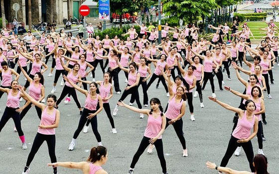 Hơn 700 phụ nữ nhiều tỉnh thành đồng diễn thể dục Aerobic trước Nhà hát Thành phố. Ảnh: CHÍ THẠCH |