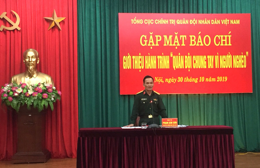 Đây là thông tin được công bố tại buổi họp báo ngày 30/10, do Tổng cục Chính trị Quân đội nhân dân Việt Nam, Bộ Quốc phòng, tổ chức. Hành trình “Quân đội chung tay vì người nghèo” là hoạt động nhằm hướng tới chào mừng kỷ niệm 70 năm Ngày hội Quốc phòng toàn dân (22/12/1989 - 22/12/2019), 75 năm Ngày thành lập Quân đội nhân dân Việt Nam (22/12/1944 - 22/12/2019).