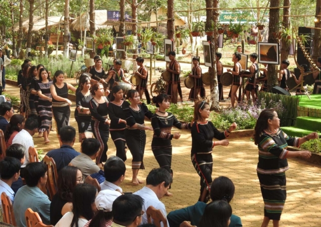 Giới thiệu văn hóa cồng chiêng tại rừng thông Măng Đen. Ảnh: VOV |