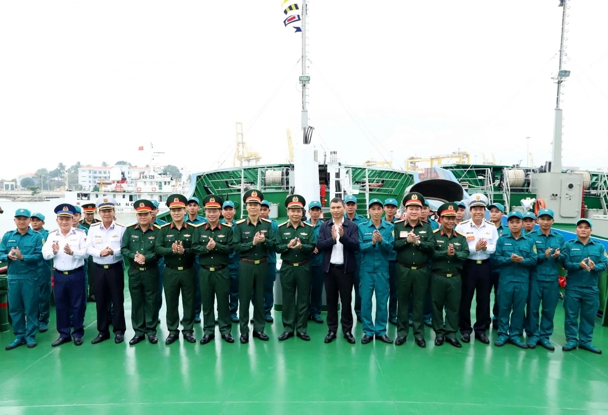 Lãnh đạo Bộ Quốc phòng, Quân chủng Hải quân và các đại biểu động viên cán bộ, chiến sĩ Hải đội dân quân thường trực tỉnh Quảng Ngãi, thành phố Đà nẵng trước giờ hội thi, hội thao. Ảnh: VOV |