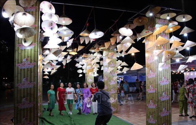 Khách du lịch hào hứng chụp ảnh tại các không gian nghệ thuật sắp đặt nón lá Việt Nam. Ảnh: TTXVN |