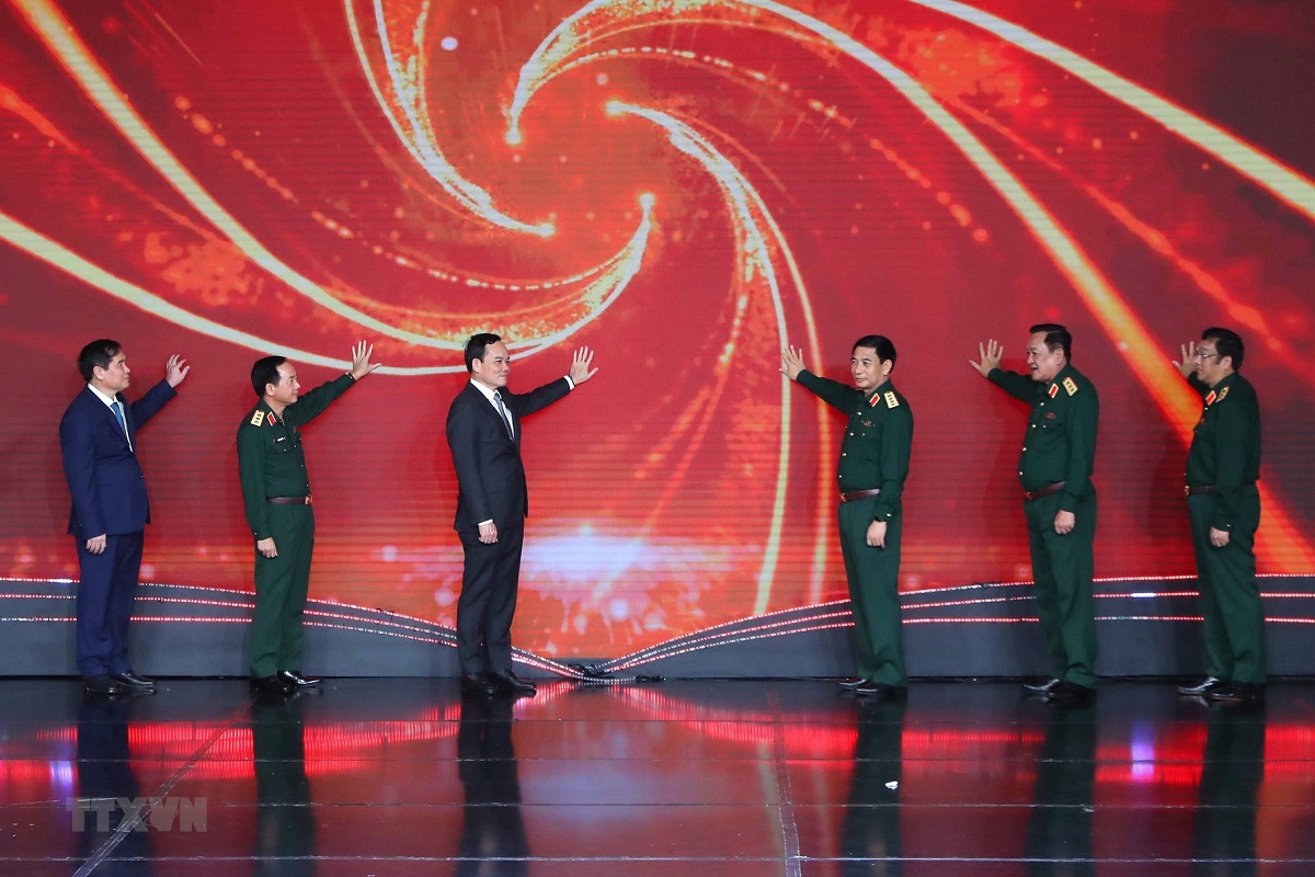 Các đại biểu thực hiện nghi thức khai trương Cơ sở Dữ liệu Văn bản Pháp luật về Quân sự, Quốc phòng. Ảnh: An Đăng/TTXVN |