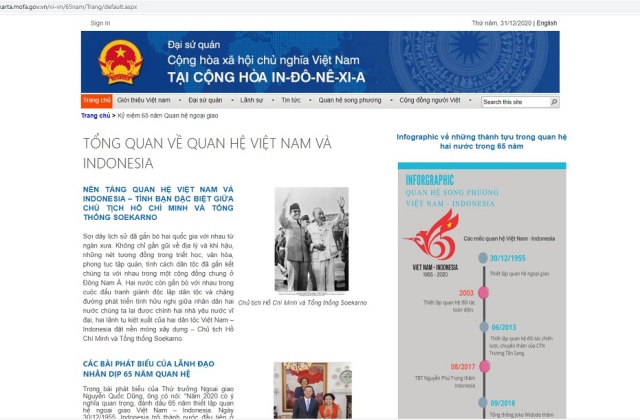 Nhân kỷ niệm 65 năm thiết lập quan hệ ngoại giao Việt Nam-Indonesia (30/12/1955 - 30/12/2020), ngày 30/12, Đại sứ quán Việt Nam tại Indonesia khai trương trang chuyên đề tổng hợp các hoạt động kỷ niệm được tổ chức trong suốt năm vừa qua tại địa chỉ https://vnembassy-jakarta.mofa.gov.vn/vi-vn/65nam/Trang/default.aspx.