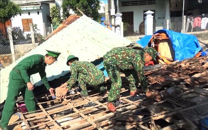 Bộ đội biên phòng Bình Định giúp người dân phường Nhơn Bình dọn dẹp đống đổ nát do mưa bão - Ảnh: Nguyên Linh/TTXVN |