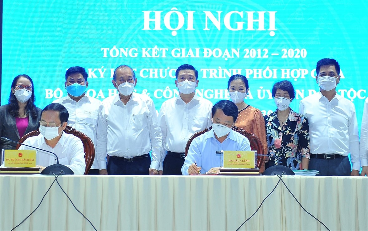 Ký kết chương trình phối hợp giữa Uỷ ban Dân tộc và Bộ Khoa học và Công nghệ giai đoạn 2021- 2030. Ảnh: Minh Đức/TTXVN |