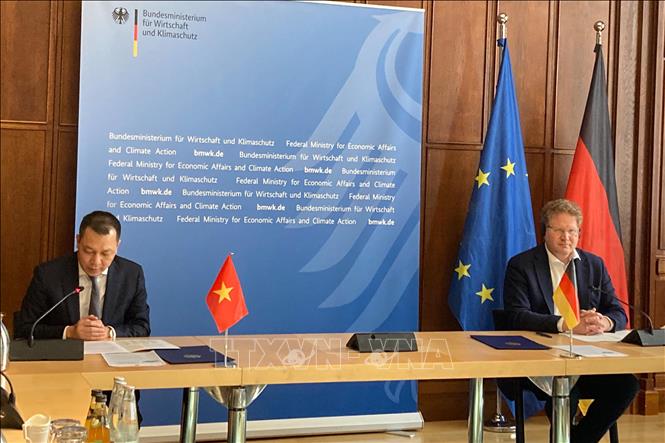 Thứ trưởng Công Thương Đặng Hoàng An (trái) và Quốc vụ khanh Bộ Kinh tế và Bảo vệ khí hậu CHLB Đức Patrick Graichen kích hoạt Ngày Năng lượng Việt Nam - CHLB Đức lần thứ nhất. Ảnh: TTXVN |