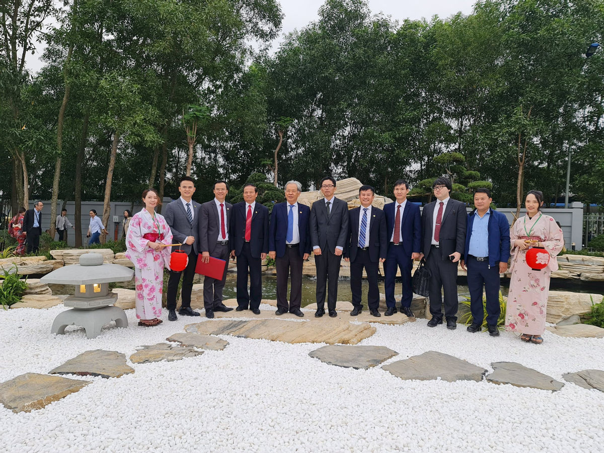 Các đại biểu chụp ảnh lưu niệm tại khu vườn Nhật Kyo-sei-no-niwa. - Ảnh: Báo Tài nguyên môi trường. |