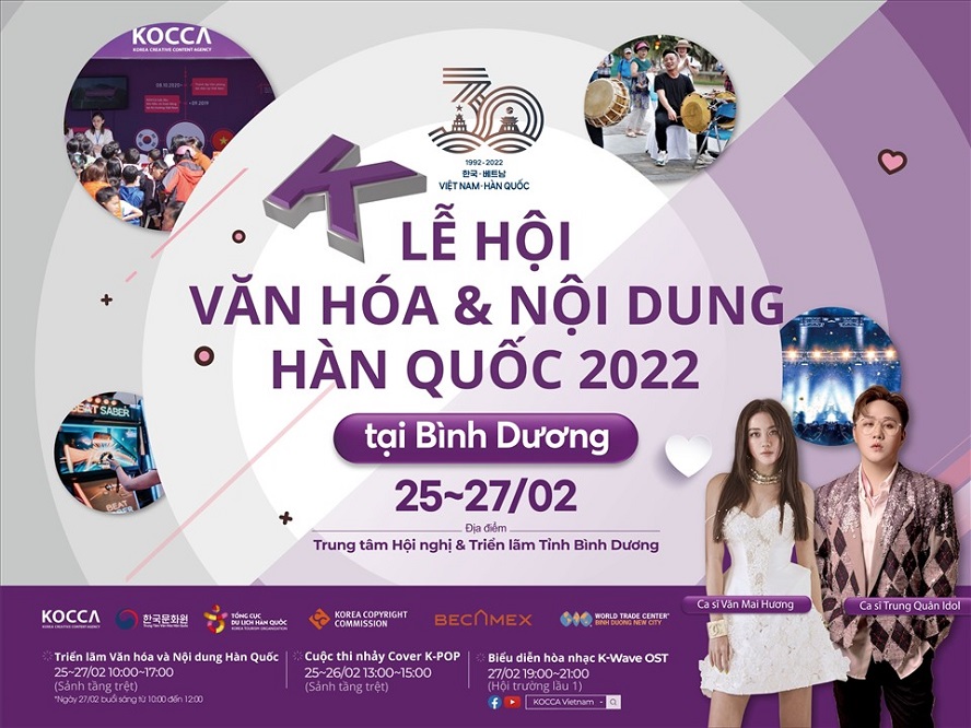Theo đó, từ ngày 25/2, sẽ diễn ra Lễ hội Văn hóa và Nội dung Hàn Quốc cùng nhiều sự kiện về chương trình thỏa thuận hợp tác chiến lược giữa Bình Dương và quận Gangnam (thành phố Seoul, Hàn Quốc), nhằm thúc đẩy hoạt động thương mại và trao đổi văn hóa giữa các bên. Đây cũng là một trong những hoạt động trong chiến lược phát triển “Vùng đổi mới sáng tạo Bình Dương” với các đối tác Hàn Quốc phát triển ngành công nghiệp tại Bình Dương.
