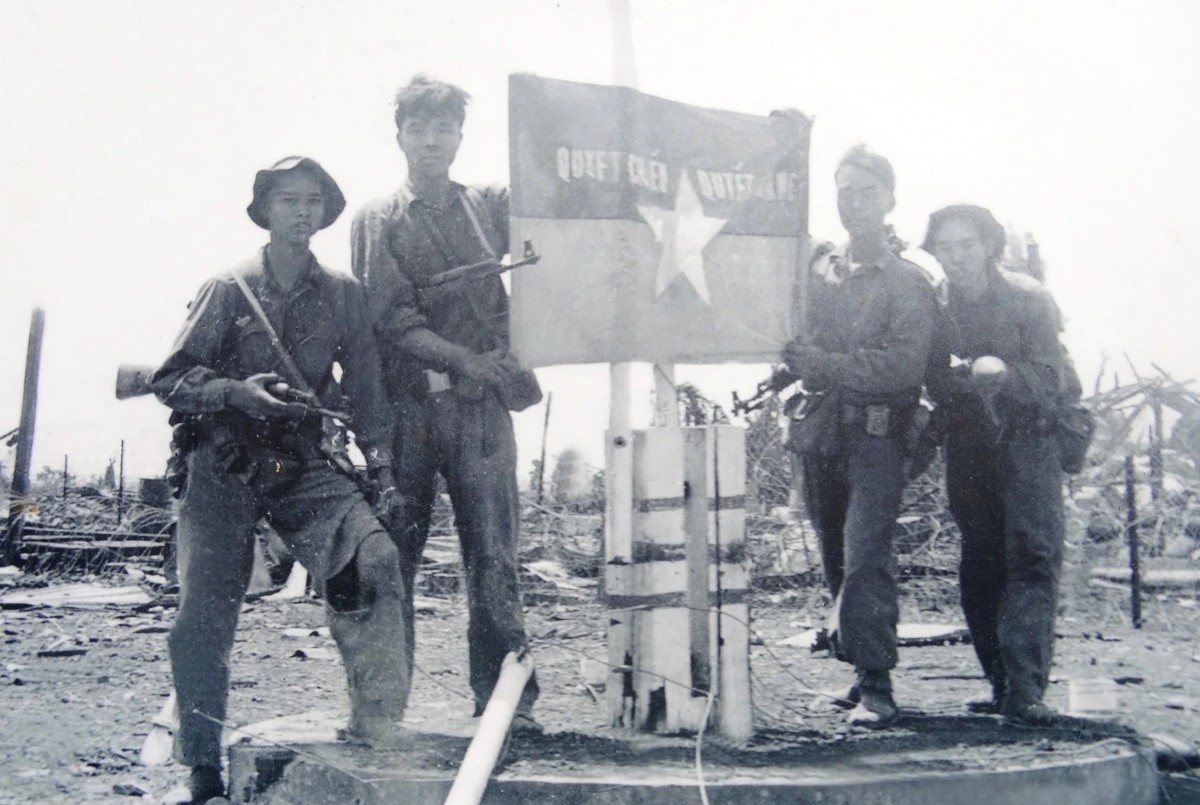 Quân giải phóng vui mừng giương cao cờ quyết thắng tại khu Mai Hắc Đế, Buôn Ma Thuột ngày 11/3/1975. Ảnh tư liệu |