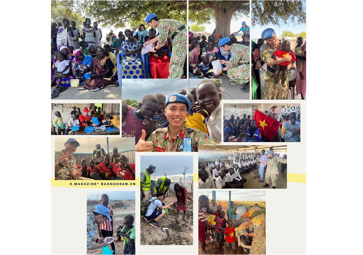 Trung úy Nguyễn Sỹ Công cùng các đồng nghiệp và bạn bè quốc tế với các hoạt động gìn giữ hòa bình tại Nam Sudan - Ảnh: Báo Nghệ An |